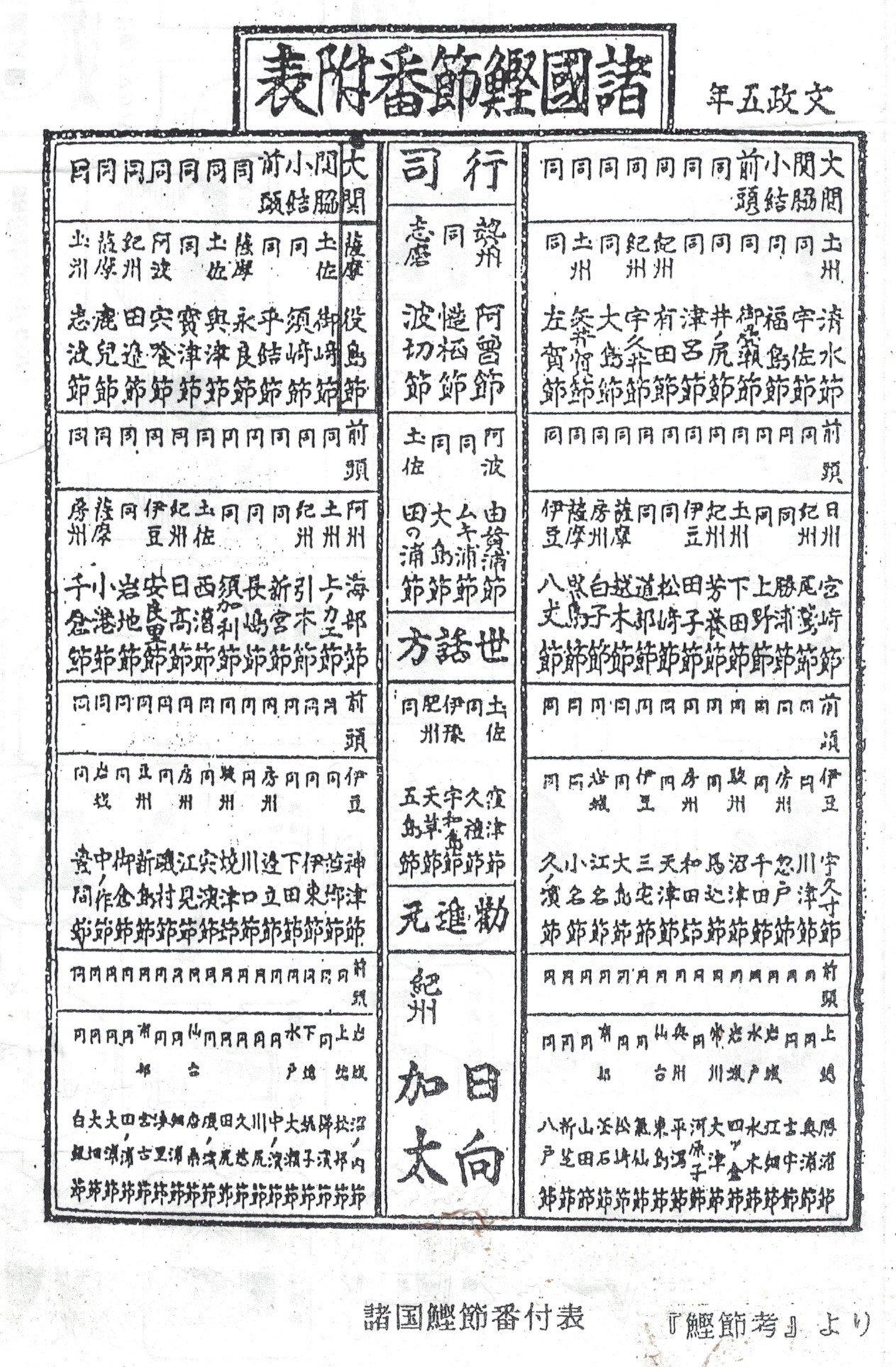 ◆諸国鰹節番付附表 全国の鰹節を評価した番付表。「薩摩、永良部節」が西の前頭二枚目として高く評価されている。ちなみに、西の大関は「薩摩、役島節」とある(屋久島か?)。<鰹節考> ![]() |