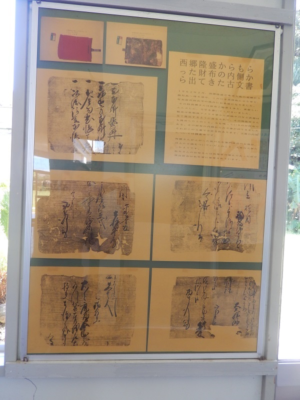 ◆西郷隆盛がお礼に渡した巾着の写真と、中から見つかった書類のコピーが口永良部歴史資料館(金岳中学校)に展示されている。写真の左上が巾着の写真コピー。![]() |