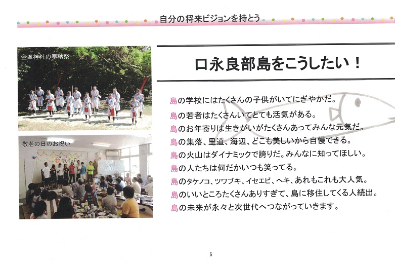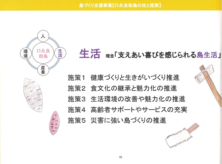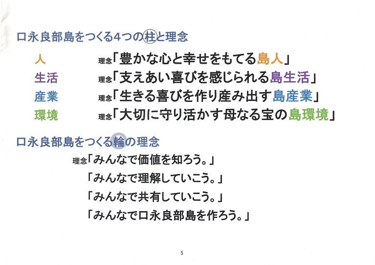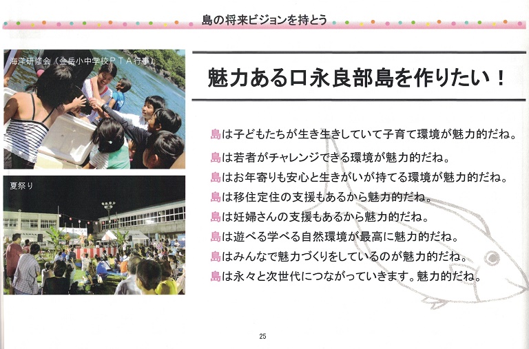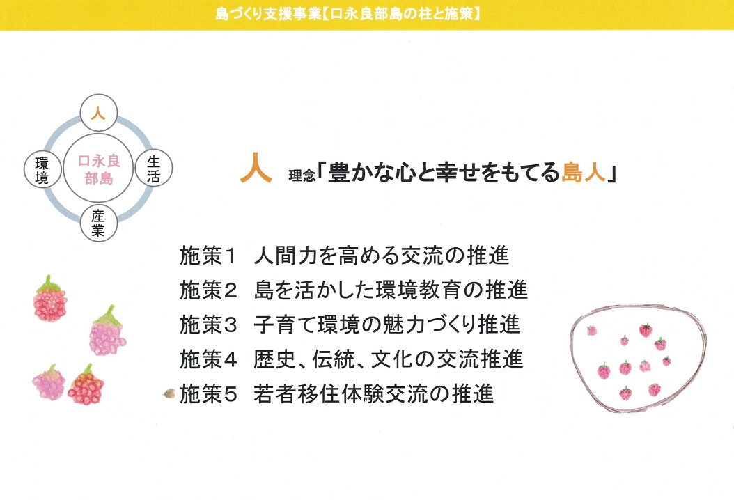 これまで島のことを島民が考えるための場づくりを実践してきた。「本音で語ろう会」や「里のエコツアー」など。島の価値を知り、理解し、共有することを目的に、人・生活・産業・環境の調和を目指している。広島大学、慶応大学など多くの大学が、口永良部島に通って、地域の人とすったもんだしながら、お互いに色々なことを学んでいる。