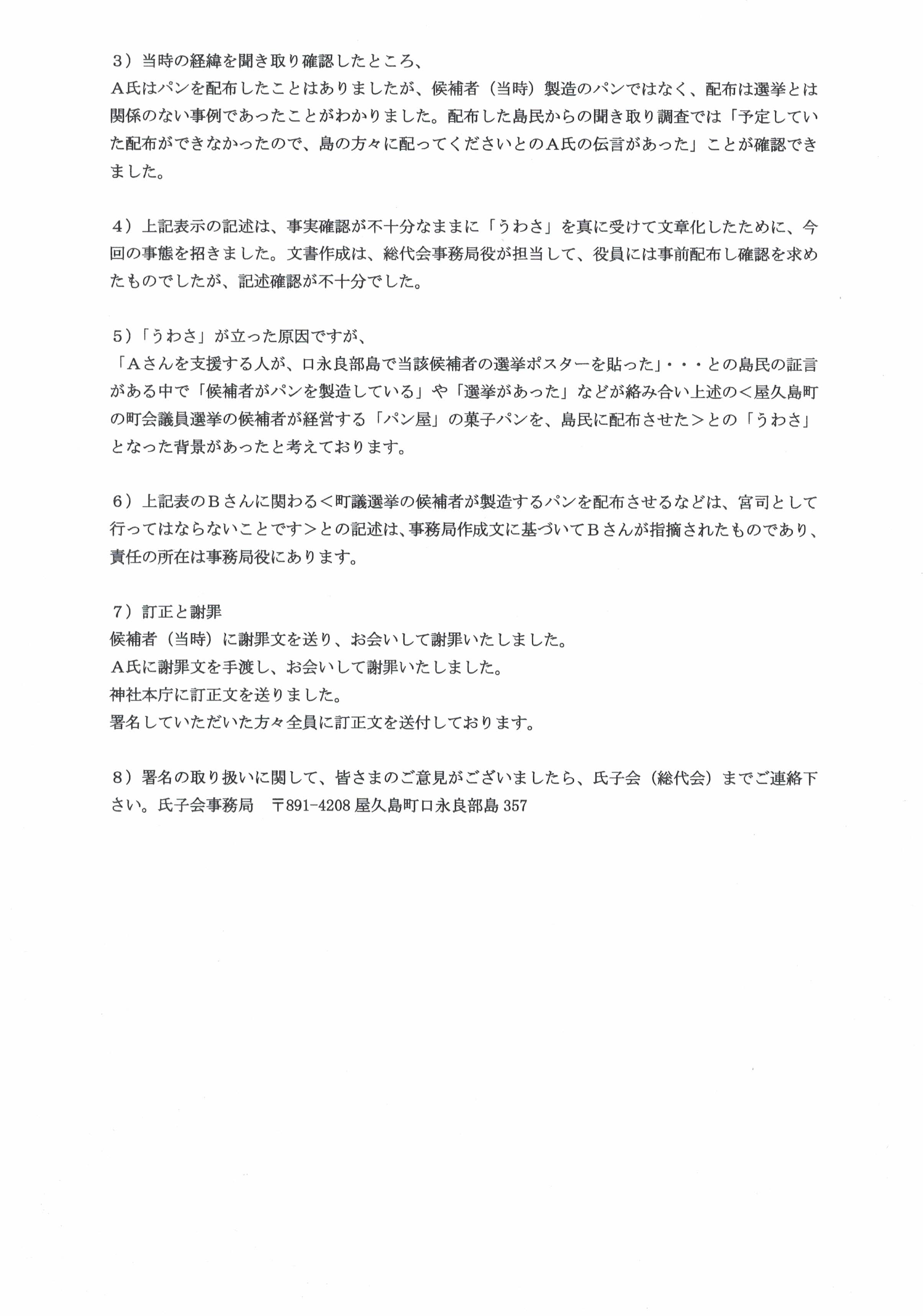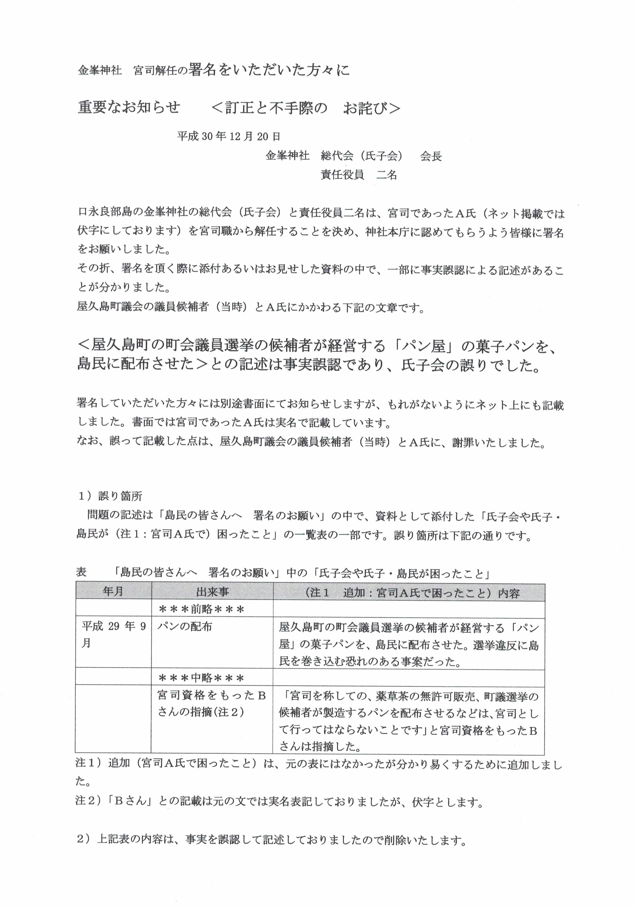 口永良部島の金峯神社宮司解任の署名を頂いた方々への報告書です。